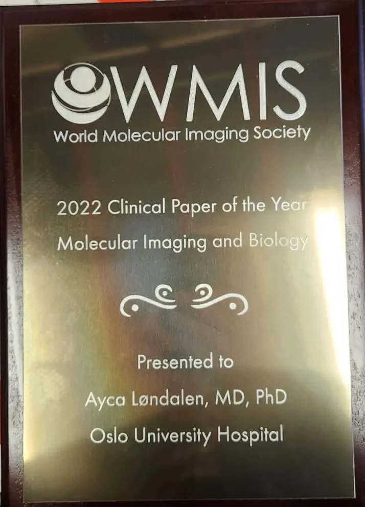 Ayca Løndalen received the prize for Clinical Paper of the Year for her work published in “FDG PET/CT and Dosimetric Studies of [177Lu]Lu-Lilotomab Satetraxetan in a First-in-Human Trial for Relapsed Indolent Non-Hodgkin Lymphoma—Are We Hitting the Target?” in Molecular Imaging and Biology. The award was presented at the World Molecular Imaging Congress in Prague.